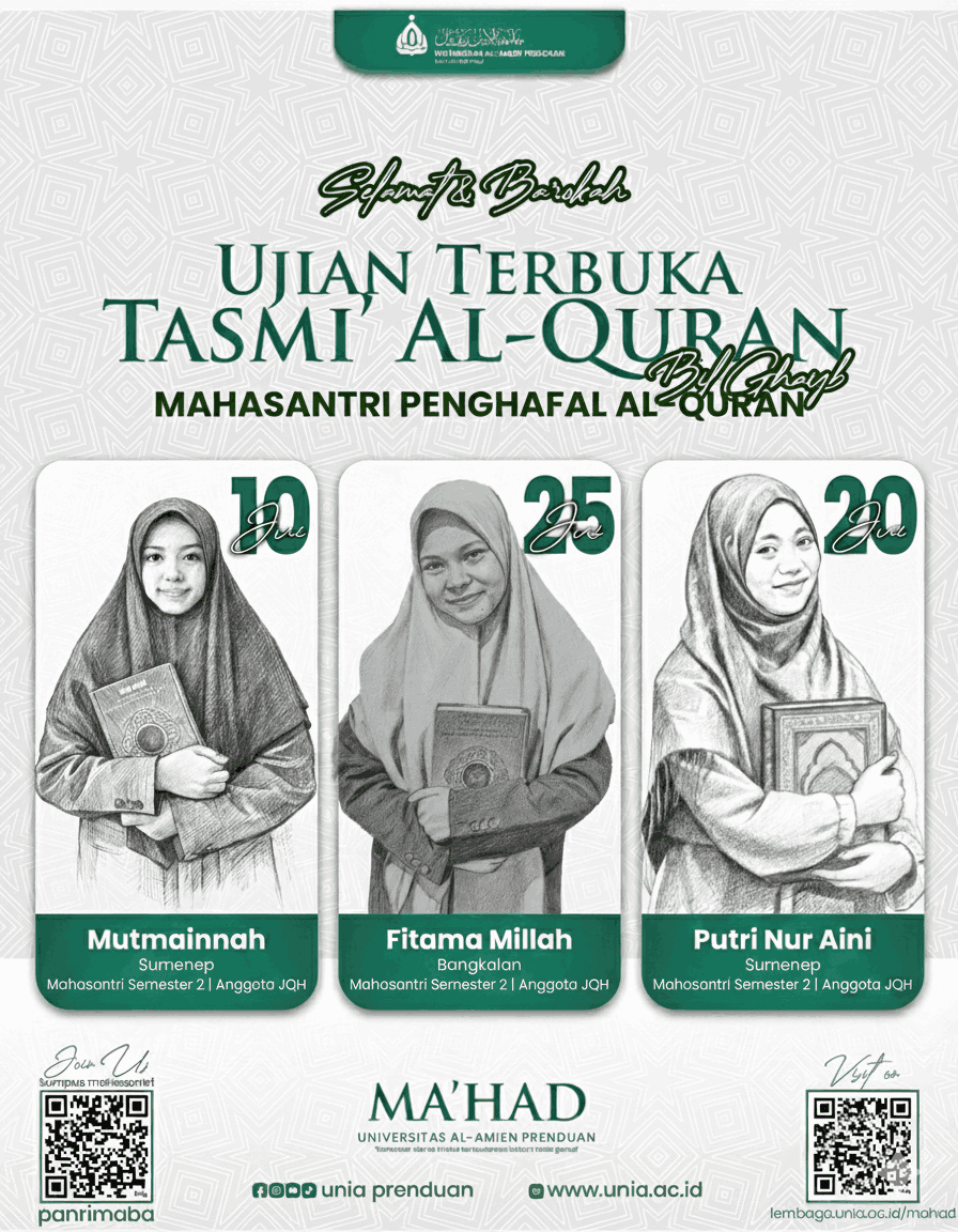 Ma’had UNIA Prenduan – Tradisi menjaga hafalan Al-Qur’an terus dirawat dengan ketat di lingkungan Universitas Al-Amien Prenduan (UNIA). Tiga mahasantri yang tergabung dalam program Jam’iyyatul Qurro’ wal Huffadz (JQH) UNIA sukses menaklukkan Ujian Terbuka Tasmi’ Al-Qur’an bil-ghaib. Ketiganya berhasil melampaui syarat kelipatan 5 juz untuk bisa melanjutkan hafalan ke tahap berikutnya.